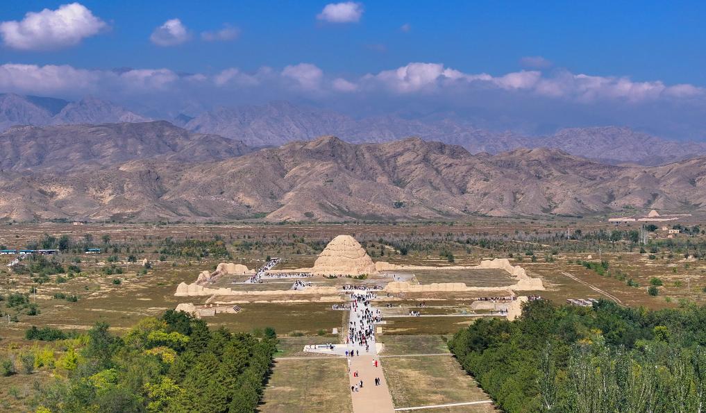 2025年10月2日,游客在西夏陵遗址区参观三号陵(无人机照片)。新华社记者 冯开华 摄