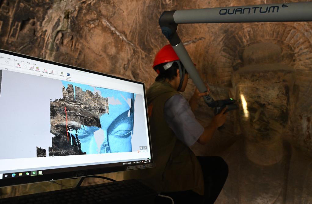 2025年4月9日,武汉大学文化遗产智能计算实验室团队成员在魏字洞使用关节臂扫描仪对佛像进行数字化扫描。新华社记者 李嘉南 摄